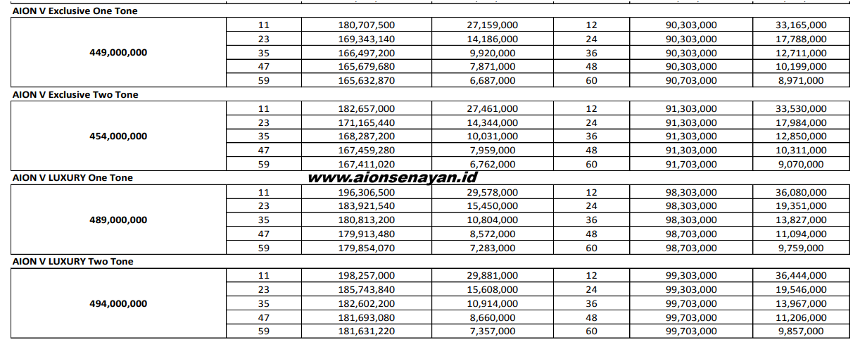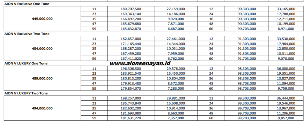 Berikut gambaran umum simulasi kredit Aion V (estimasi, dapat berbeda tergantung dealer & leasing):